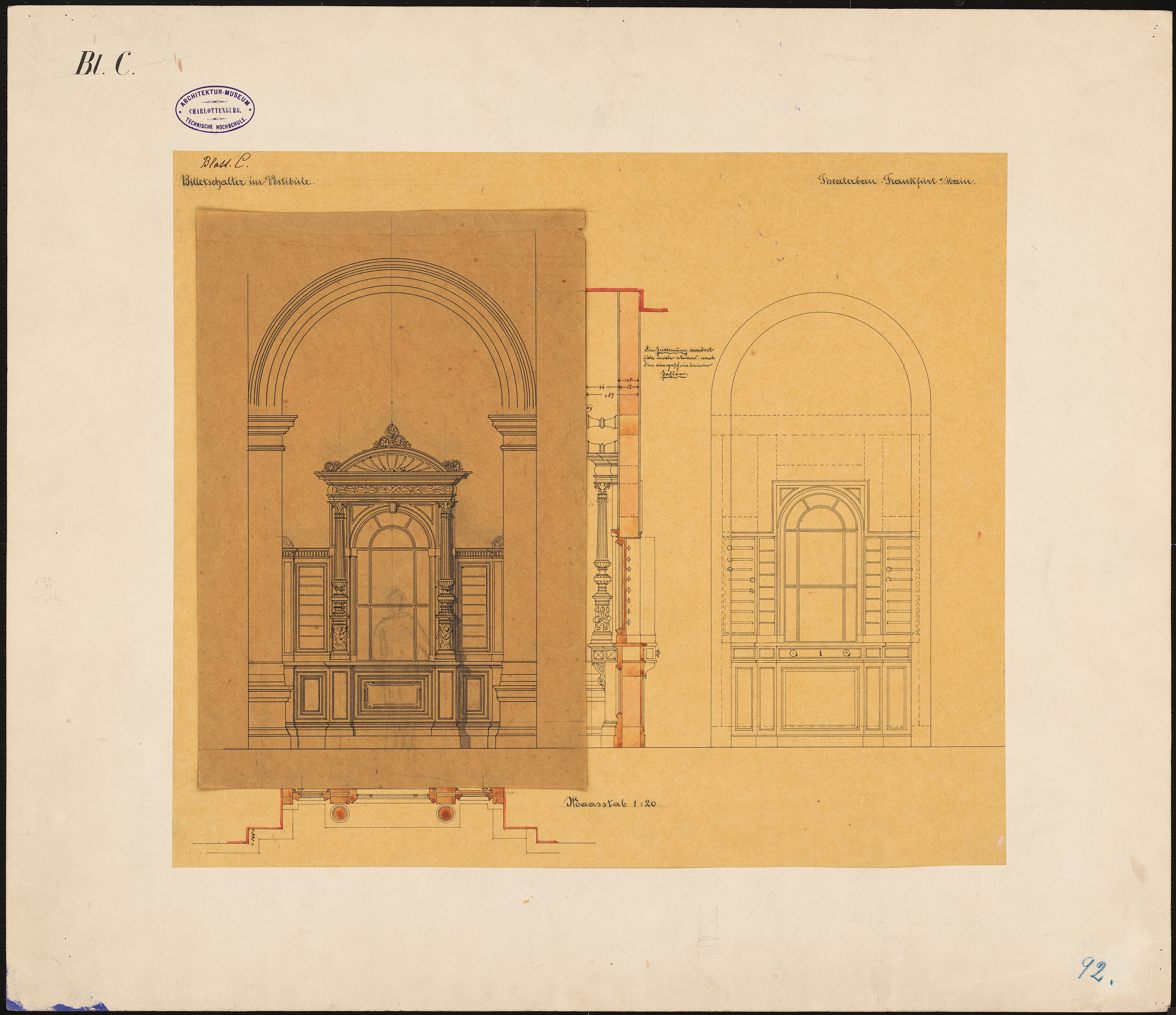 Billetschalter im Vestibül: Ansichten, Schnitte 1:20, aufgeklebte Variante
