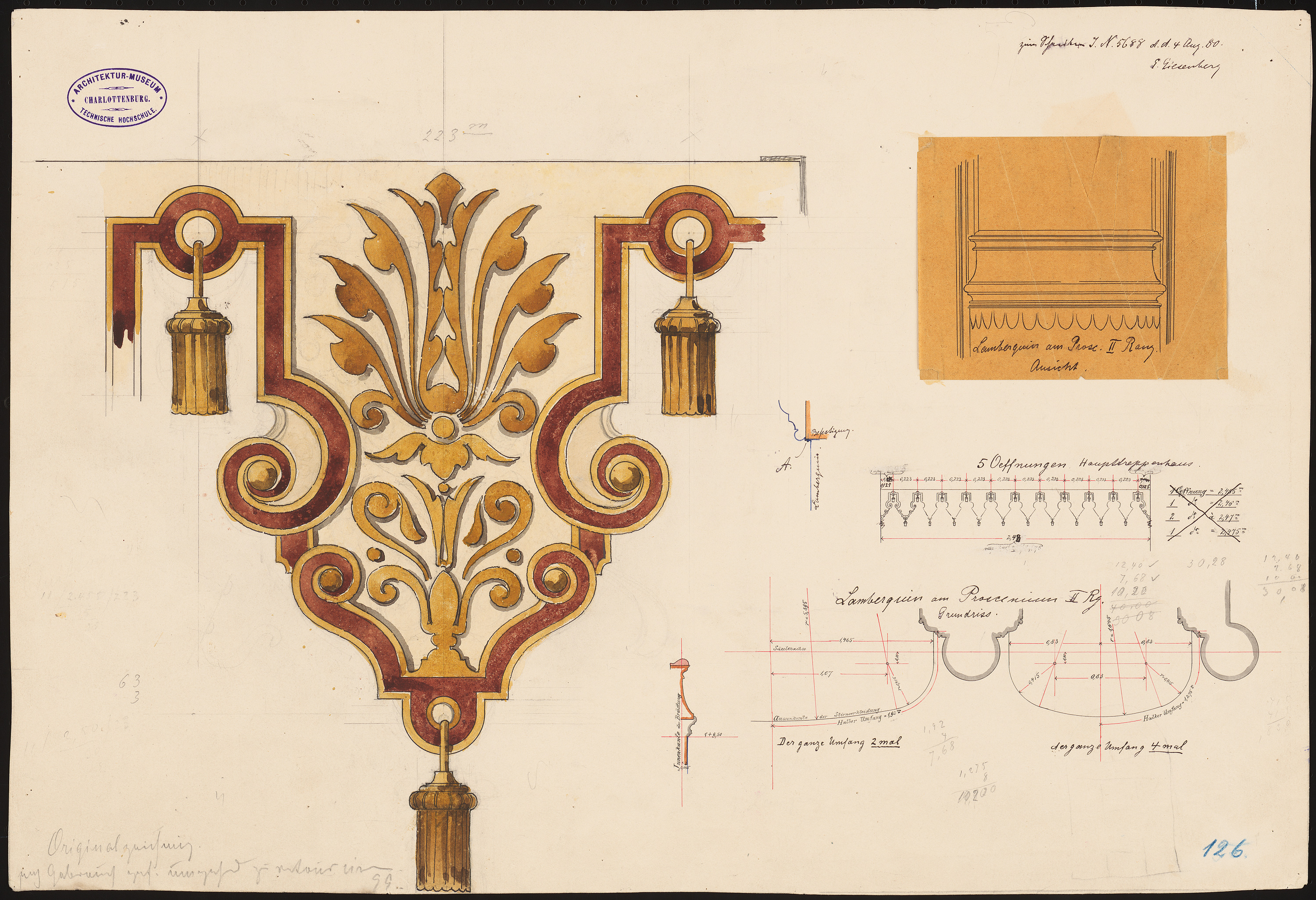 Lamberquin am Proszenium II. Rang: Grundriss, Schnitte, aufgeklebte Ansicht