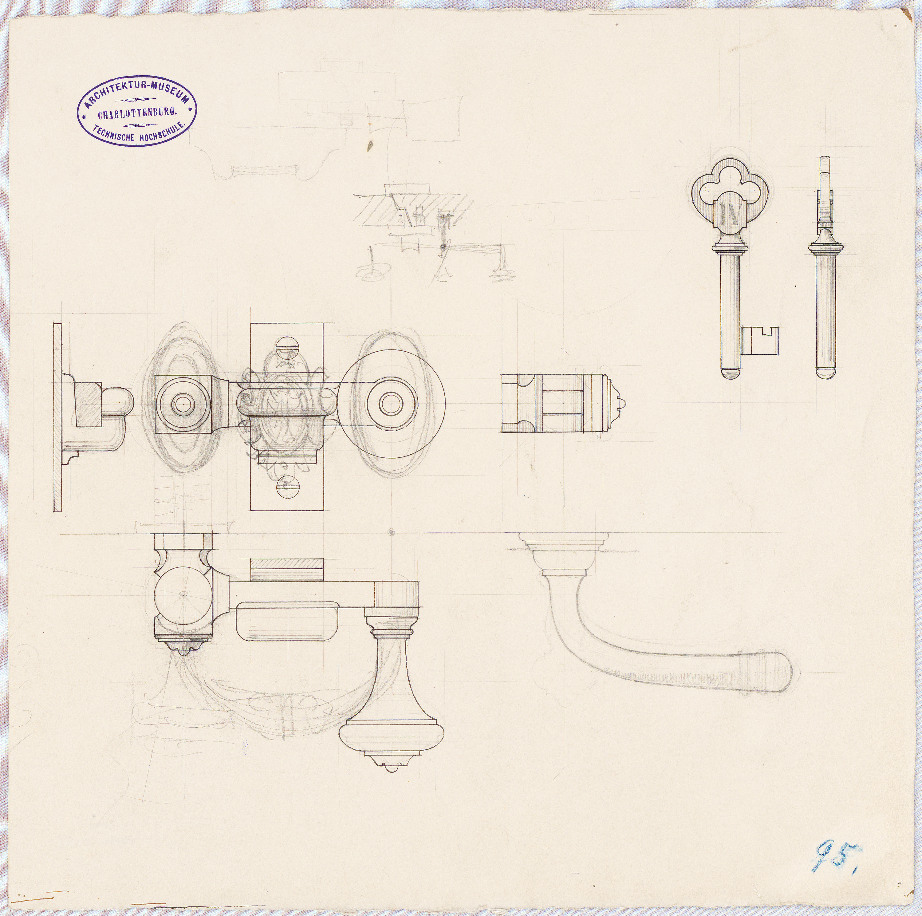 Details von Türgriff, Schloss, Schlüssel; Ansichten, Schnitte