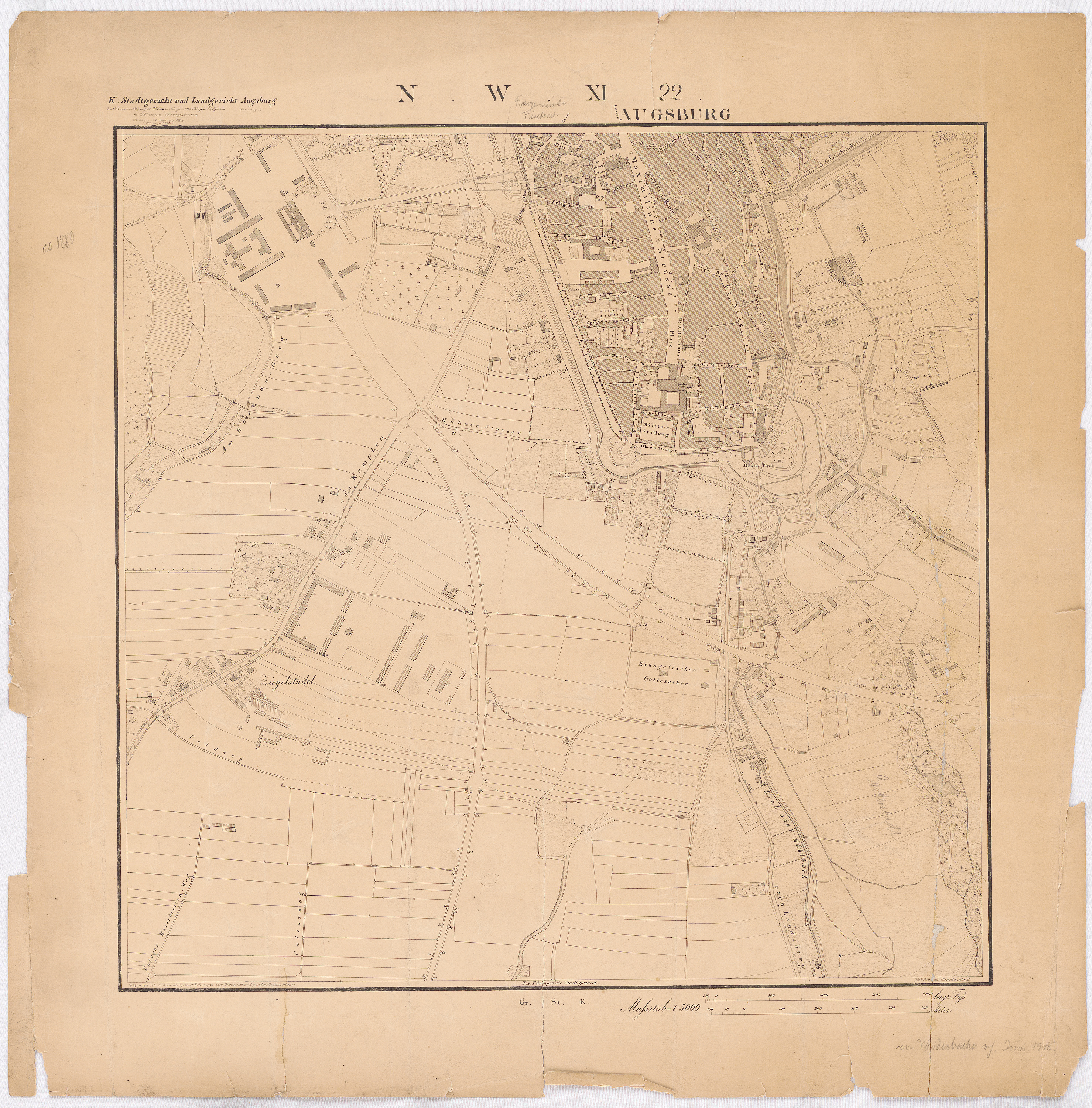 Messtischkarte Augsburg. Zum Projekt gehörend: Hermann Jansen, Verkehrsberuhigung am Gögginger Tor, Augsburg
